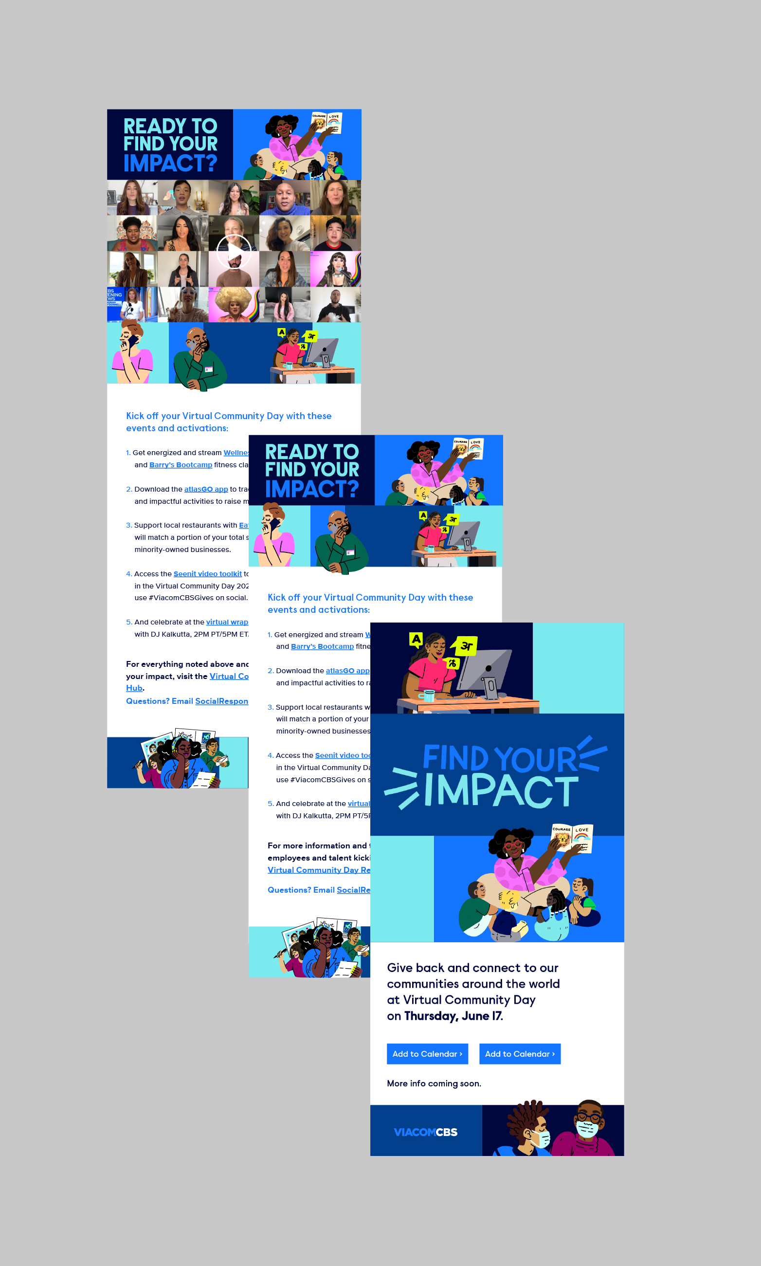 Due to COVID, this was the second year that ViacomCBS’ Community Day was virtual with the exception of a few in-person volunteer opportunities. I wanted to work with an illustrator to depict the volunteer opportunities that the employees could engage, give back, and connect with. It was extremely important to depict characters that were diverse and represented the variety of people who work at the company.